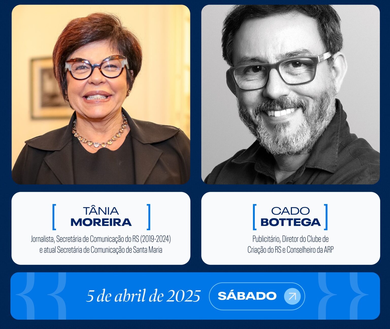 Tânia Moreira e Cado Bottega são mais dois nomes confirmados no Comunica Mercado – para além da pauta. Com ingressos à venda neste link, o evento acontece no dia 5 de abril, no Hub Aliança, em Passo Fundo. Inédito no norte gaúcho, o evento voltado para comunicação corporativa terá seis painéis para discutir branding, gestão de crise, comunicação política, estratégias de relacionamento, reputação e os desafios do mercado da comunicação para o futuro.